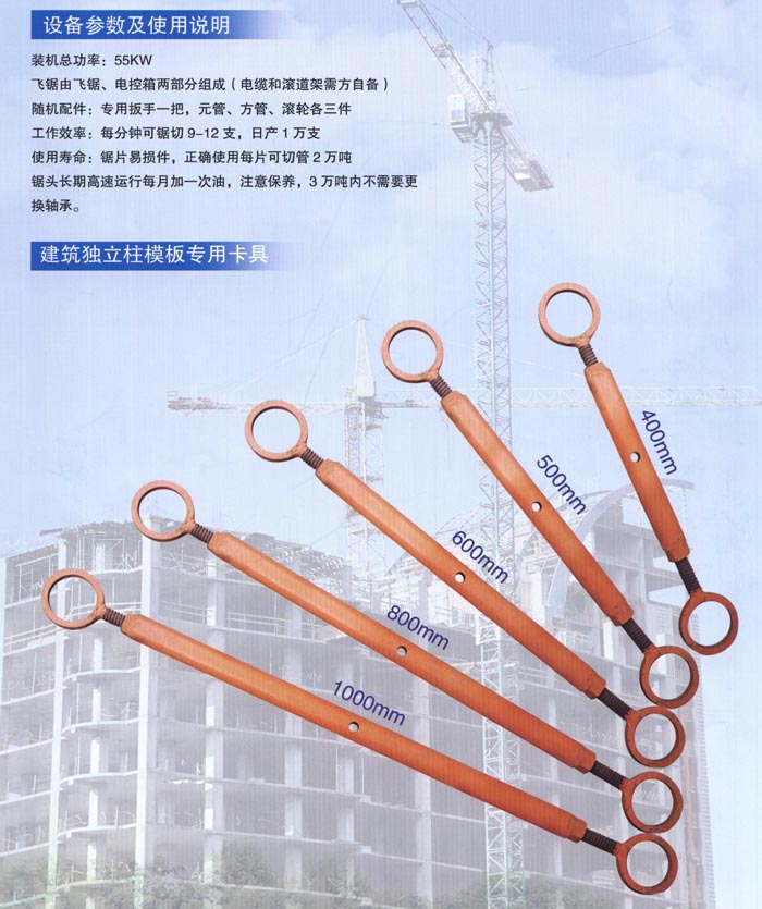 装机总功率:55KW飞锯由飞锯、电控箱两部分组成(电缆和滚道架需方自备)随机配件:专用扳手一把,元管、方管、滚轮各三件工作效率:每分钟可锯切r}1tiJ一12支,日产1万支使用寿命:锯片易损件,正确使用每片可切管2万吨锯头长期高速运行每月加一次油,注意保养,3万吨内不需要更换轴承。